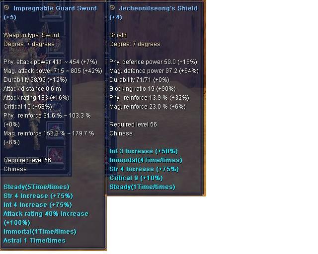 hätte gerne mal gewusst wie viel ich fürn Sword+5 crit10 und nen Shield +4 BR19 nehmen kann. Beides lvl 56 Bilder gibts nachher noch mal dazu.