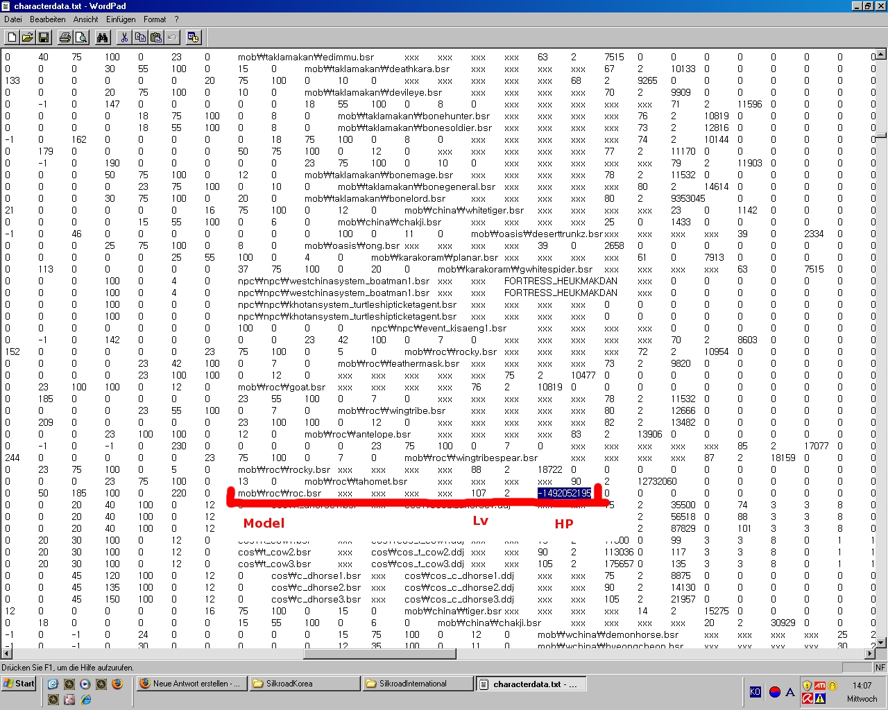 ^^ Media.pk2 sagt, dass Roc Lv 107 ist, in Roc Mountain spawnt/spawnen soll(te?) und -1492052195 HP hat.
