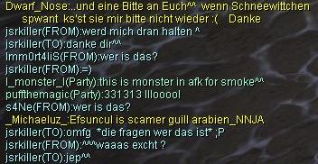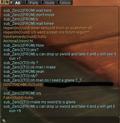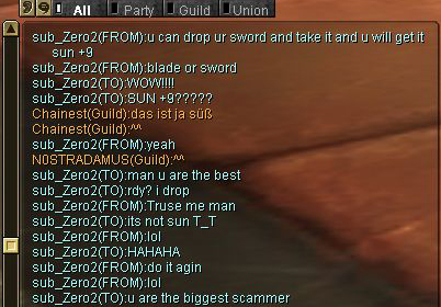 also hier ^^ wollte mich jmd scammen ^^ hat gemeint willst nen sun sword, ich so ne will nen sun blade ^^ dann nach ner weile hab ich mit gemacht und als er meinte drop nun dein schwert, hab ich gesagt aber ich will doch ne glavie xD und der meinte drops einfach und du kriegst sun +9 ^^ hab dann meine cape fallen lassen und sie kam zu mir ^^ danach meinte ich HAHA scammer xD ich liebe es das zu sagen und so zu chatten mit denen ^^
