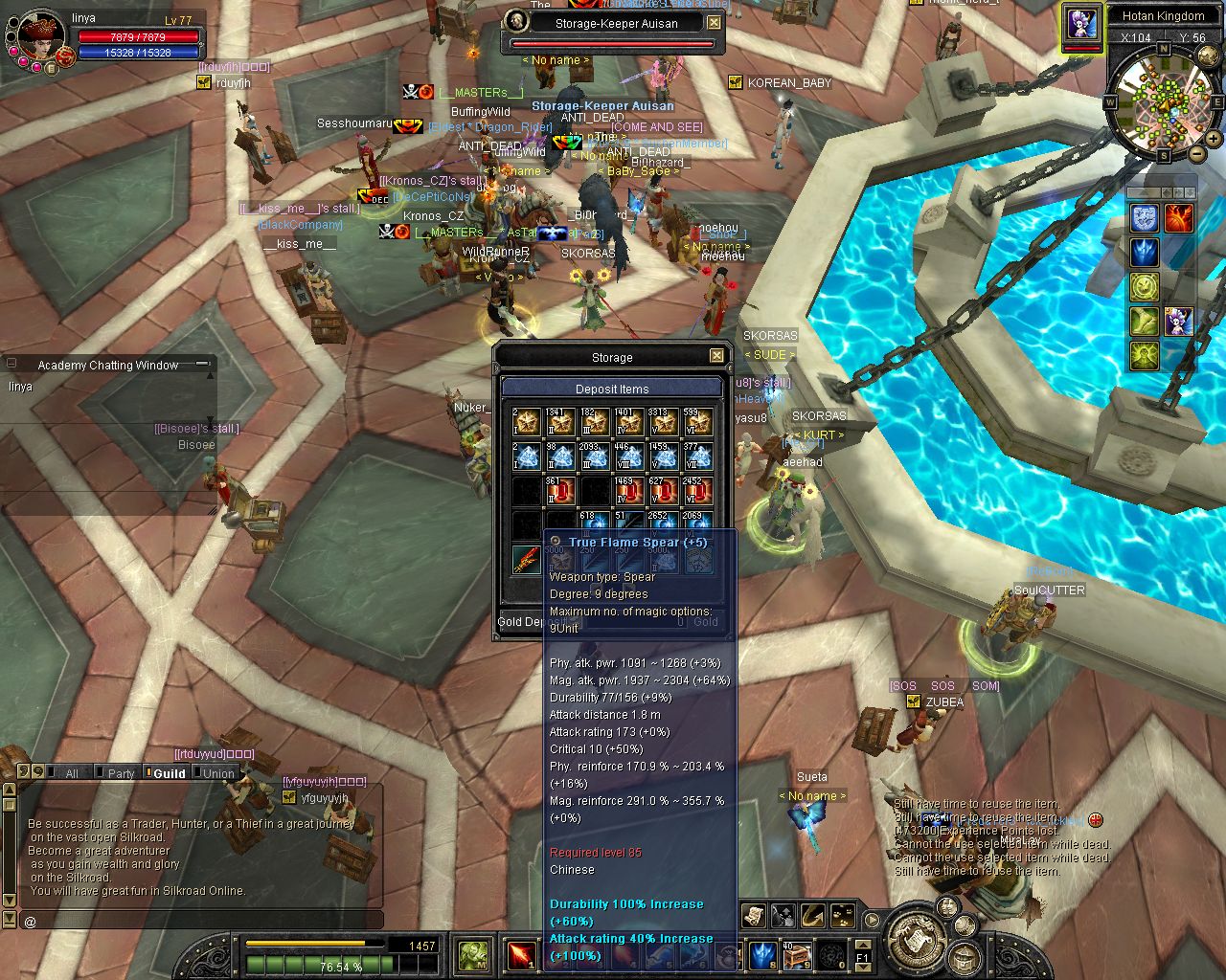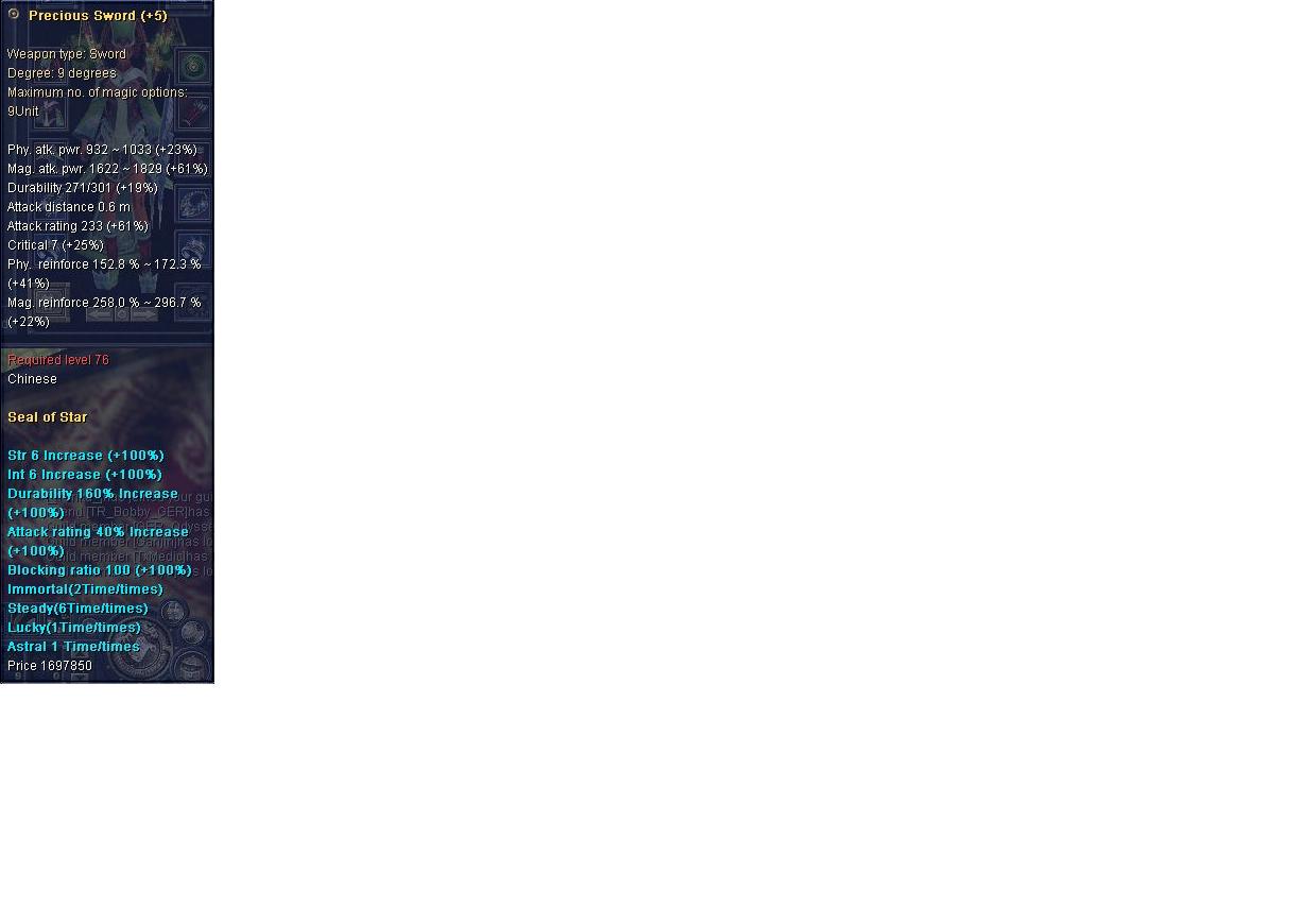 oha. 100mil fürn 76+5 sos sword und das mit solchen Stats. Guter Deal.. Auf Greece kosten selbst lvl 76 sos waffen noch 200mil+. Naja kuwait verseuchter server halt :D .