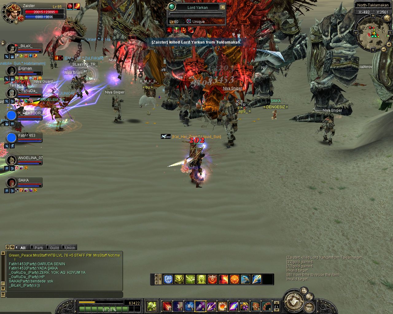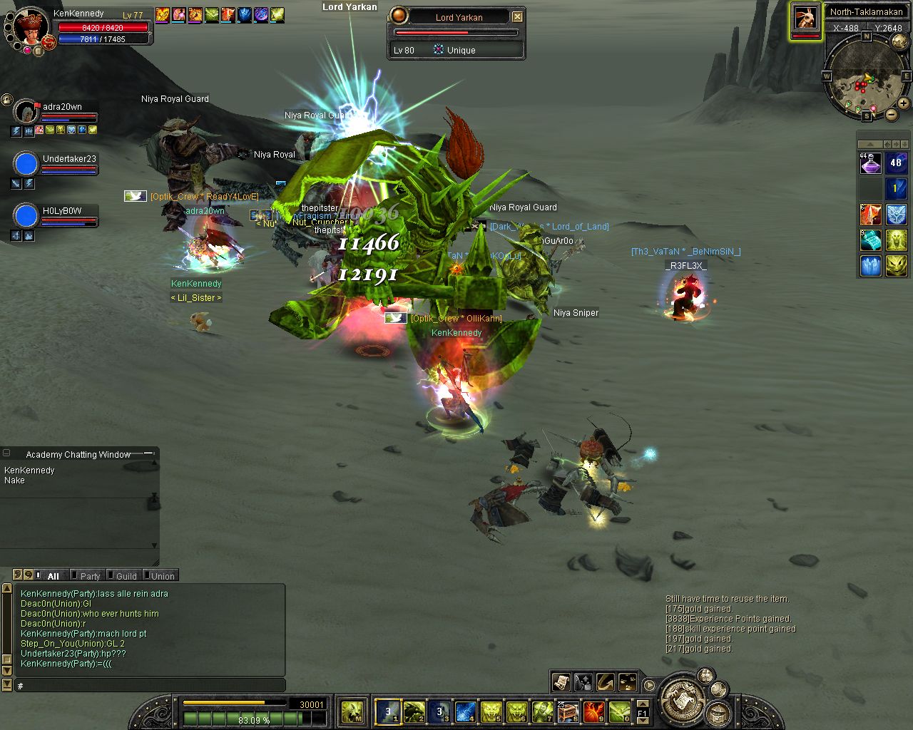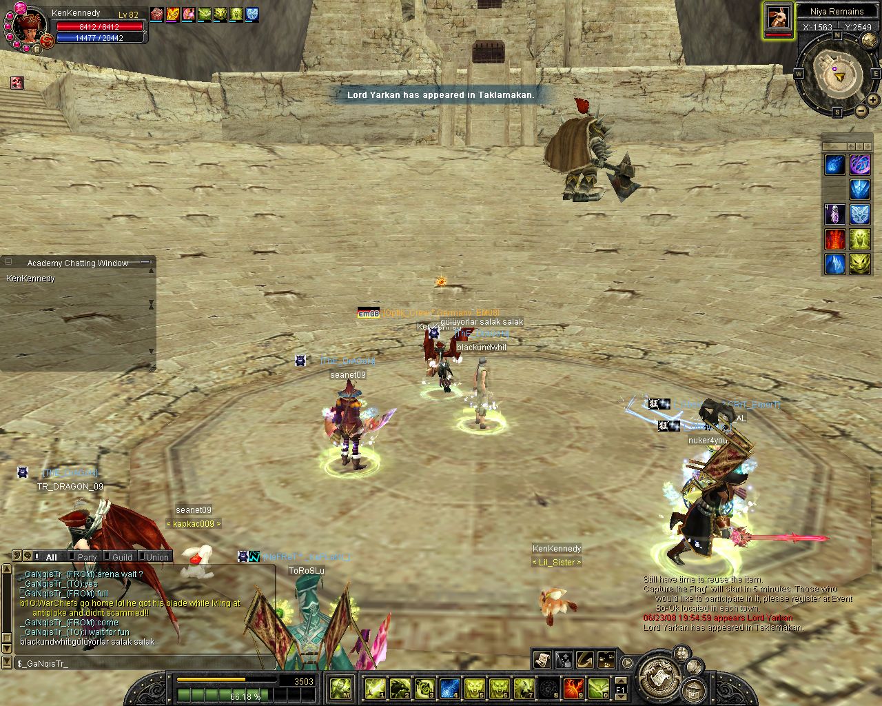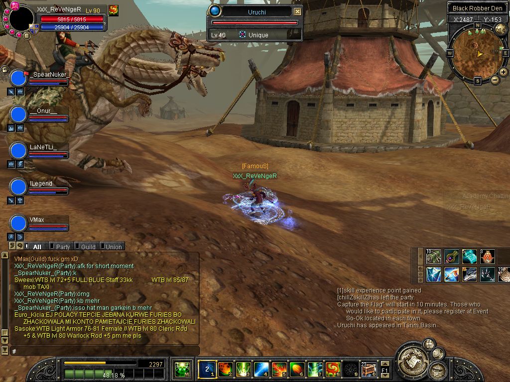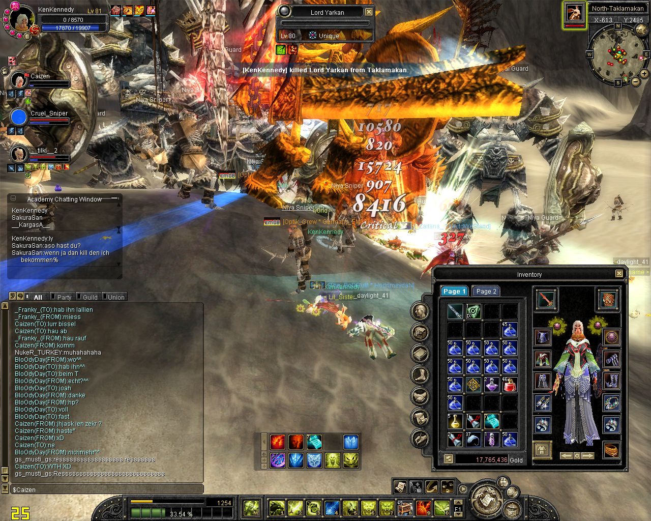 ich komm on und reit zum lvl platz aufeinmal spawnt isy.. hmm war ich grad vorbei bei karakoram ><... Weitergelaufen und aufeinmal spawnt Yarkan.. ich: hoffentlich net Tempel... ich lauf ein stückchen aufeinmal bekomm ich nen kurzen lagg (bei unqieus bei mir immer so^^) und er steht alleine vor mir :P wollte luren damit ich ihn in einer arbeit von etwa 3 stunden (ja shit mein ticket xD) alleine killen kann (zu den Devil eyes z.b) aber dann kam Glavier und dann wurde es nixmehr :P