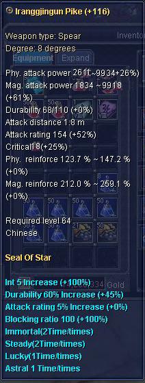 so hab mein spear grad noch was gepimpt und da beim attackrating erhöhen mein physikal attack power auf 0 % gefallen ist hab cih das auch mal was gepimpt ^^ naja seht nu selbst