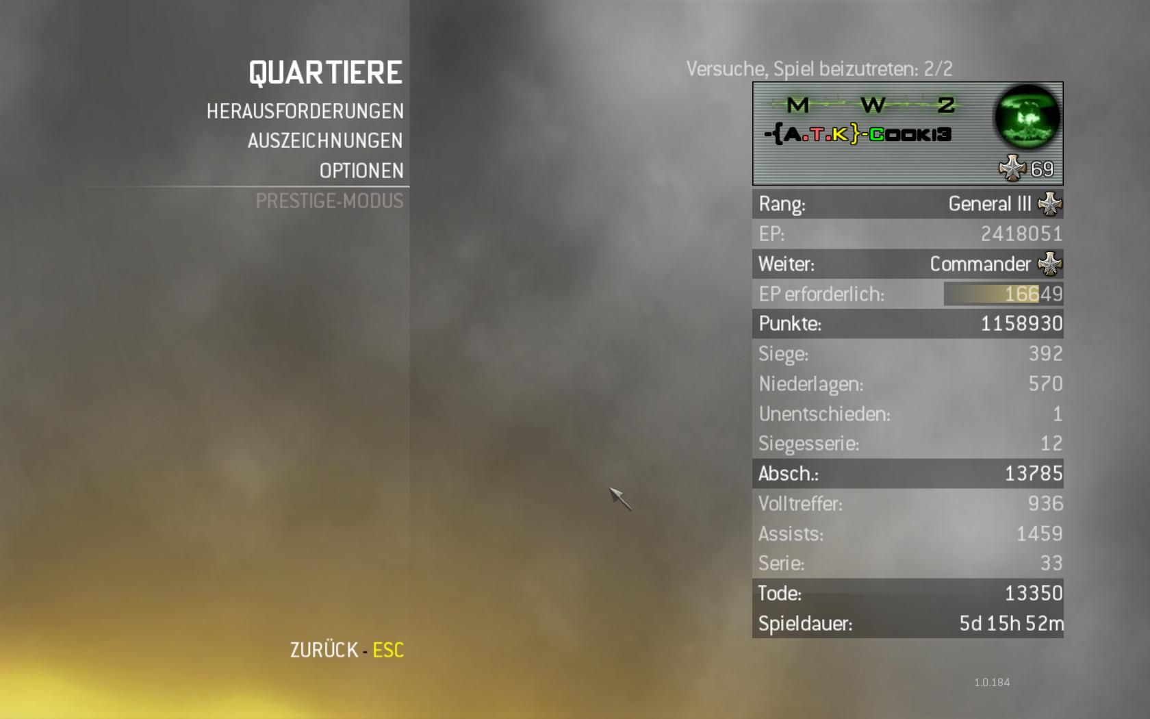 Mal sehen, wenn ich heute noch zocke erreiche ich Prestige 3. ;) Wieder neu anfangen, juhu. Macht aber bisher immer wieder Spaß. Leider gibt's die neuen Maps immernoch nicht. :(