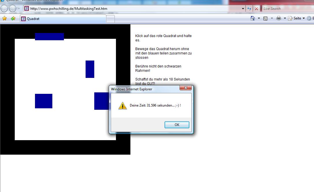 Ich finde solche sachen doof, weil es net groß auf den Grips ankommt. Nun gut schon, mit Grips kann man das Ding austricksen und das andere ist eigentlich bloß ein Gedächtnis spiel. Nach 5 Versuchen hatte ich den ganzen Ablauf bis 20 sek intus und das hat dann auch nix mehr mit Reaktion zu tun.