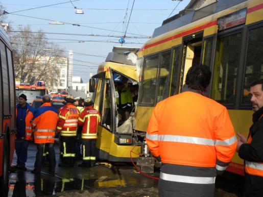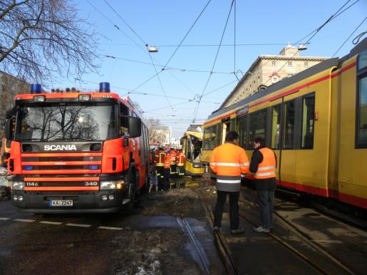 Heute gab es in Karlsruhe einen schweren Strassenbahnunfall. 2 Strassenbahnen sind frontal zusammengestoßen. Die Fahrer schweben noch in Lebensgefahr. Über die Ursache ist noch nichts bekannt.