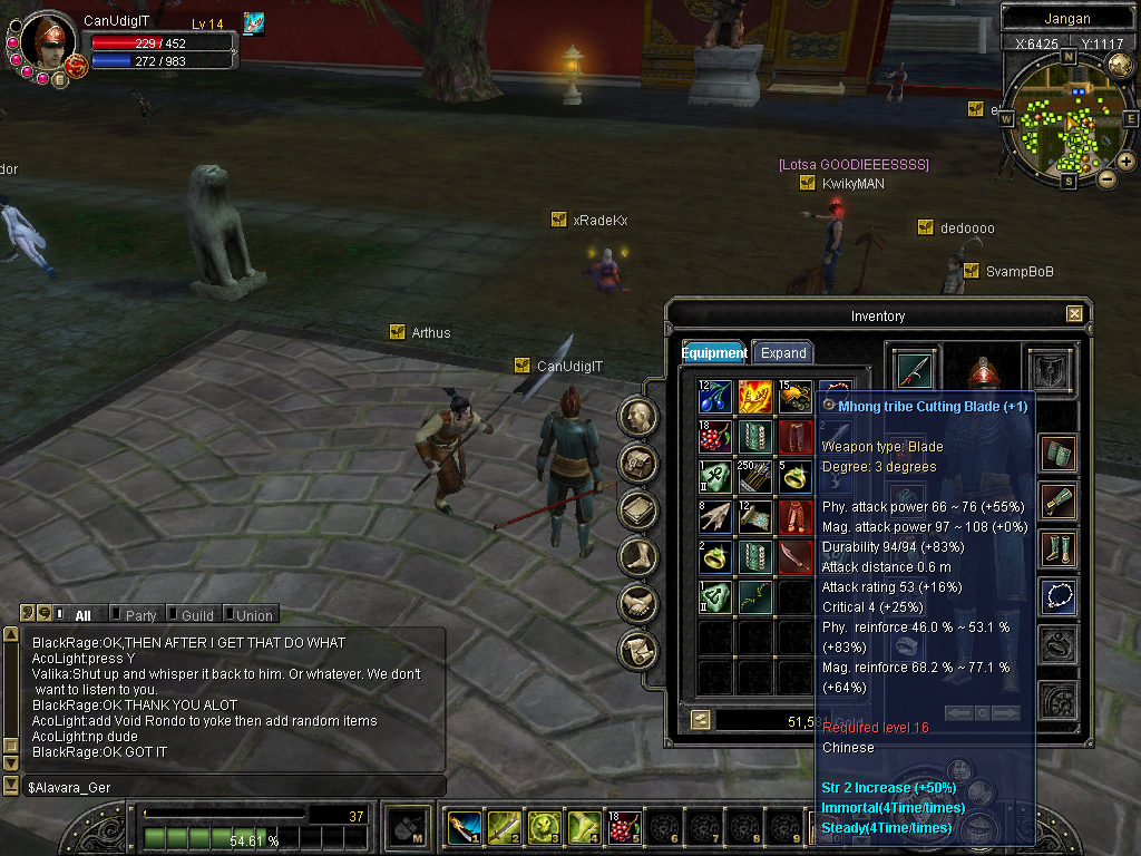 Ich hab die gleiche Waffe aber + 4 Naja, aber wenn du ne Kang Tribe Cutting Blade hast bist du ein Glückspilz, zumindest wenn du eine mit +4 hast.. Weil eine Kang hat die gleichen Werte wie eine Mhong +4, hoffentlich habt ihr mich verstanden :s